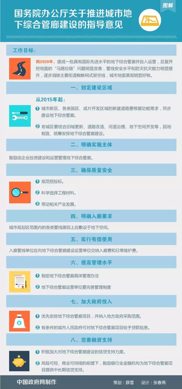 为了支持地下综合管廊建设,我国还将加大政府投入。中央财政要发挥“四两拨千斤”的作用,省级人民政府要加强地下综合管廊建设资金的统筹,城市人民政府要在年度预算和建设计划中优先安排地下综合管廊项目,并纳入地方政府采购范围。有条件的城市人民政府可对地下综合管廊项目给予贷款贴息。