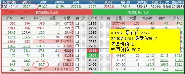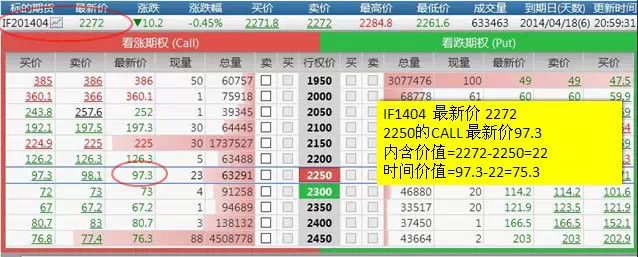 我们看这两张图,我们还是以CALL买权为例来看,标的资产性的价格是2272,我买一个2250的买权,也是就现在价格是2272,我以2250去买到它,那么通过这个公式可以看到内含价值是22,时间价值是75.3。