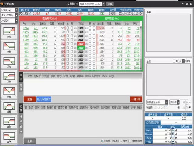 我们来看这个图片左边的部分,它其实都在程序里已经设定好模块,你对市场的看法涨、跌、不涨、不跌;包括突破,盘整、盘涨、盘跌,你只要选择你对市场未来走势的看法,相应的就会选择一些期权报价的交易,然后你再根据盈亏平衡点和收益曲线,包括收益、赚钱、赔钱的概率就好了。