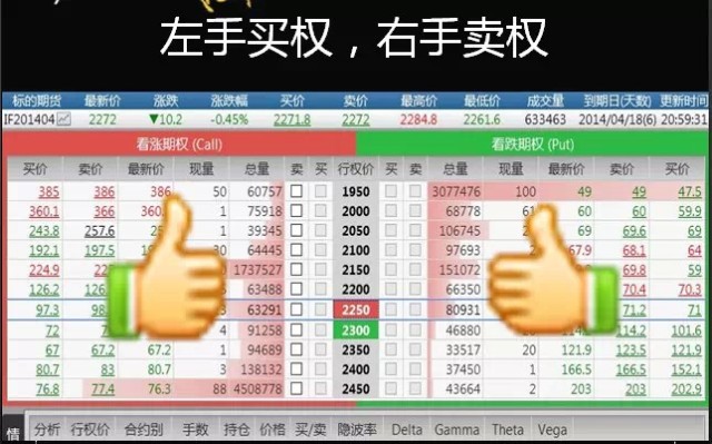 我们来看期权与其他品种的不同,股票是一个方向做多,期货是两个方向做多和做空,期权上是四个方向;如果大家现在有兴趣的话,可以对着期权的T形报价,伸出你的双手左右和右手,我们用最简单的方式去练习记住这个期权的简单交易;当我们面对T形报价的时候左手买权,右手卖权,拇指向上代表买入,拇指向下代表卖出,拇指向上代表的是获利无限,拇指向下代表的是亏损无限。