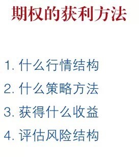 其实做期权交易最简单的获利方法,是以下这四点:第一首先你判断接下来会是一个什么样的行情结构,根据你判断的行情结构来确定用什么样的策略方法去做这笔交易,你确定了获利方法以后你确定通过对行情的判断和策略方法去赚什么钱,最后最重要的是评估这个策略的风险在哪里,投资一定是永远要把控制风险放在第一位的。