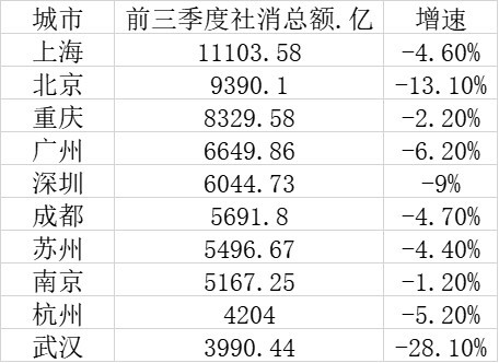 加快建设消费中心城市,对构建双循环格局十分重要。通常来说,一座城市要成为消费中心城市,本地较大的购买力是一大基础。那么,在疫情之后,我国消费力最强的城市有哪些? 第一财经对前三季度我国主要城市社会消费品零售总额统计发现,前十城市分别是上海、北京、重庆、广州、深圳、成都、苏州、南京、杭州和武汉。值得注意的是,这也是今年GDP总量位居前十的城市,但社消与GDP位次并非一一对应。 在前三季度数据中,上海继续稳居榜首;重庆超越广深两座一线城市位居第三;武汉虽然仅位居第十,但正在快速“回血”。 需要说明的是,各城市发布的今年前三季度社消数据是以2019年第四次全国经济普查(下称“四经普”)之后的数据作为基数的,相比今年初各地发布的社消数据仍以四经普之前的数据作为基数,更为准确。 上海前三季度社消超万亿,打造国际消费中心城市 从区域分布上来看,消费力前十的城市,有7个来自沿海发达地区,其中长三角4个(上海、苏州、南京和杭州),珠三角2个(广州、深圳),京津冀1个(北京)。有3个来自中西部地区,其中成渝城市群2个(成都和重庆),长江中游城市群1个(武汉)。 10个城市中,有9个来自南方,北方地区仅剩北京。这也说明,在经济发展南北分化的同时,消费力也呈现南北分化的态势。 其中,长江经济带共有7个城市进入前十。近年来长江经济带对我国经济的支撑作用日益凸显。统计数据显示,2019年,长江经济带地区生产总值合计457805.17亿元,占全国经济总量的46.2%,占比较2018年提升2.1个百分点。 在消费总量方面,上海和北京这两大强一线城市位居前两位,上海自2017年超越北京之后,就一直稳居榜首。今年前三季度上海是唯一一个社消总量超过万亿大关的城市。数据显示,前三季度,上海市实现社会消费品零售总额11103.58亿元,比去年同期下降4.6%。从三季度单季来看,消费品市场加速回暖,社消总额同比增长8.9%。其中,8月份同比增长11.5%,近14个月内重新实现两位数增长。 一方面,上海是城区人口规模超2000万的超大城市,也是我国城市经济的排头兵,消费力也最强。同时,长三角是我国最大城市群,也是经济最为发达的城市群,上海是整个长三角城市群的龙头,消费腹地广阔。 另一方面,近年来,上海多措并举,加快建设国际消费中心城市。早在2018年4月,上海就发布了《全力打响“上海购物”品牌加快国际消费城市建设三年行动计划(2018-2020年)》,提出要不断提升消费贡献度、消费创新度、品牌集聚度、时尚引领度、消费满意度,最终建成具有全球影响力的国际消费城市。 今年4月,上海出台了《关于提振消费信心强力释放消费需求的若干措施》(下称《措施》),提出以“一大节庆”为统领,聚焦重点消费板块,推出一批“实招”,为更好应对疫情影响促进消费回补释放、更快推进国际消费中心城市建设步伐提供了强力支撑。 5月4日晚间启动的上海“五五购物节”就是《措施》中提出的一大重点,主题为“五五购物节,全城打折季”,时间横跨二季度的劳动节、儿童节、端午节等多个重点节日。 目前,上海境外旅客购物离境退税规模占全国一半以上,居全国第一;上海已成为新零售的策源地和竞技场,主要电商直播平台的用户数量全国第一;上海引领新一轮夜间经济发展,夜间消费总额位居全国城市首位;上海每年开设首店、旗舰店数量稳居全国第一,国际知名高端品牌集聚度超过90%。 重庆超越广深位居第三 北京1~9月实现社会消费品零售总额9390.1亿元,同比下降13.1%。从消费形态看,商品零售8821.5亿元,同比下降10.8%;餐饮收入568.5亿元,同比下降37.7%。 沪京之后,西部的直辖市重庆以8329.58亿元超过广州位居第三,并大幅领先广州、深圳这两座一线城市,增速为-2.20%,在前五城市中位居第一。 广东省体改研究会执行会长彭澎对第一财经分析,重庆拥有3000多万人口,而且经济发展强劲,今年前三季度GDP已经超过广州。虽然广州、深圳人均收入比重庆高不少,但广深城镇化较早,包括家电、汽车在内的不少消费较早启动,因此当前消费增速也会放缓。而重庆正处于快速城镇化的过程中,周边人口大幅往主城区集聚,每年增量都很大,势头很猛。在本地城镇化过程中,这一群体带来了非常大的购买力。 彭澎分析,人口总量多的城市消费总量一般会比较大。重庆所在的西南区域,消费文化也一直比较浓厚,“追求安逸、舒服的生活,所以社消比较旺盛。”而且重庆的房价比较低,可支配的购买力也会更加充足。 另外,近两年,大都市旅游兴起,重庆成为火热的网红城市,洪崖洞、观音桥等成为年轻人打卡的热门景点,青年是消费的主体,都市游的火爆带动了社会消费的提升。 重庆之后,广州和深圳分列第四、五位,前三季度两市社消总量都超过了6000亿元。值得注意的是,在四经普之前,社消总量仅位列全国第七的深圳,前三季度超越了成都和武汉,位居第五。 彭澎说,深圳的人均收入整体水平比较高,收入高,消费力也会旺盛。其次,深圳的实际管理人口规模很大,流动人口多,消费也多。第三,深圳作为计划单列市,可支配的财力多,拉动的消费也比较多。 武汉大幅“回血”,强省会优势突出 尽管不及深圳,但成都前三季度社消总量也达到了5691.8亿元,稳居第六。而疫情重创之后的武汉,虽然前三季度社消同比降幅达28.1%,但总量已位居前十。未来随着武汉持续快速“回血”,