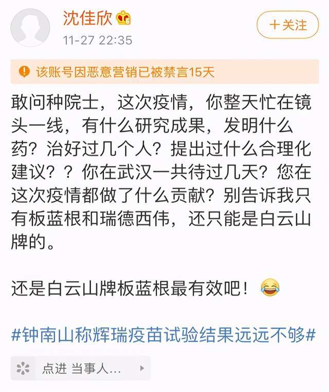 前几天,不知名女演员沈佳欣因在微博上公开质问钟南山院士,认为对方在抗击疫情斗争当中没有作出多大的贡献,只顾着活跃在一线镜头,胡吹各种药商生产的药物,被官方以恶意营销为由禁言15天,目前涉事微博已经被删除。 然而对于禁言的处罚决定,大多数人是不愿意接受的,因为沈佳欣的不当言论,已经对国家英雄造成了非常大的负面影响,换而言之就是在变相侮辱诽谤人民英雄,公然与国家和人民为敌。 最让人恨之切骨的是,事件已经发展到如此严重的地步,沈佳欣始终没有出面公开道歉,甚至还在外网注册新账号,持续攻击侮辱钟南山院士,乃至连为正义发声的爱国人士都一并被她给讽刺的体无完肤,可想而知她内心极其的凶险。 更重要的是,拥有百万粉丝的沈佳欣,被华谊兄弟打假不是旗下艺人,跟公司没有任何关系,而账号简介上标注出的代表作品也不是她的,就连使用的头像都是盗用其他女星的,甚至她是男还是女,是老还是少,也都是还是一个未知数。 不管沈佳欣是真演员,还是假演员,她的不当言行已经给社会带来了非常恶劣的影响,根据相关法律法规,完全是可以给她量刑定罪的。当然,最后还是要看她的立场和态度,以及钟南山院士会不会予以宽恕原谅。 然而一波未平一波又起,对于沈佳欣公开质问钟南山院士一事,虽然遭到了大多数人的反对,但也有少部分人是予以支持的,比如说著名打假人王海,在昨天晚上通过微博力挺沈佳欣,支持对方质疑钟南山院士,理由是“质疑求真是基本的科学精神”。 可能很多人还不知道王海是何方神圣,像同样全网闹得沸沸扬扬的辛巴燕窝事件,就是他一手给掀起出来的大风大浪,到现在都还是一个热门话题,并且还成功引起了央视的关注与报道。 由此可见,王海在打假圈里头的知名度和影响力是非常大的,能够把直播圈神坛级别的大人物辛巴实锤到底,实力绝对不容小觑。 辛巴燕窝事件余热还未散尽,王海突然将转移话题到沈佳欣事件上,可想而知他是有目的的,但绝对不是为了所谓的正义,因为他的立场本身就不正,所提出来的高大上观点,完全就是在混淆视听,偷换概念,甚至可以说是助纣为虐。 首先,王海作为一名职业打假人,最基本的素养和能力,那就是明辨是非, 而事实上沈佳欣这个人本身就是假的,身份假的,头像也是假的,连言论都是假的,那么打假人去支持一个假人,这未免显得太不专业了吧。 其次,沈佳欣在微博上发表的不当言论,根本就谈不上“质疑”,故意把钟南山院士给叫成“种院士”,就连药品名称都能够给说错,再加上她以反问的方式去否认钟南山院士对于疫情作出的伟大贡献,这明显就是在扭曲真相,恶意诋毁,轻蔑英雄,与民为敌。 最后,钟南山院士是共和国勋章获得者,是国家和人民选出来的英雄,他在抗疫斗争当中所作出的杰出贡献,全国上下无人不知无人不晓,这都是真真切切的真人真事,如果觉得质疑是科学精神的话,那么有这种极端想法的人,必须得跟沈佳欣一样严惩不贷! 来源:念寒娱评 有需要买房或者想要了解的,记得联系我们哦 联系电话15607915111