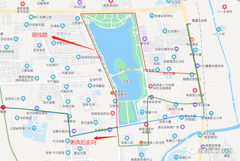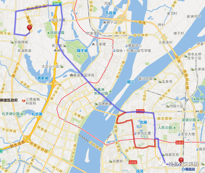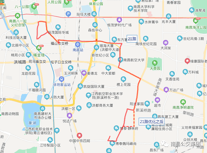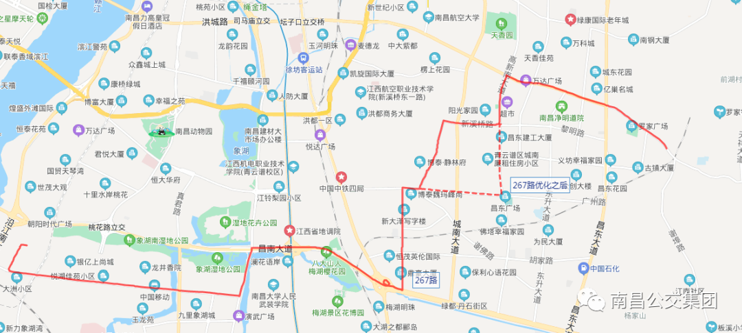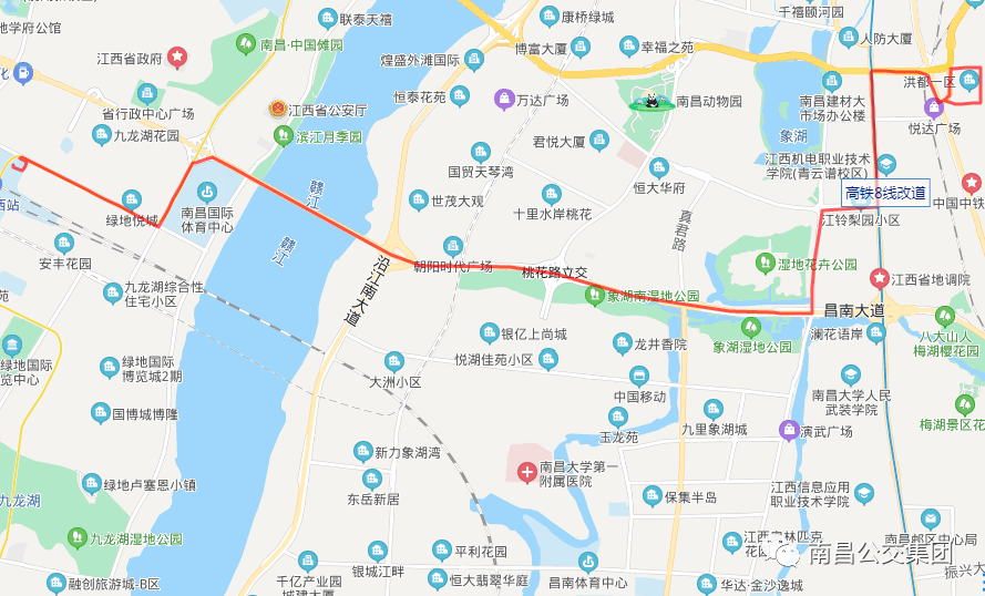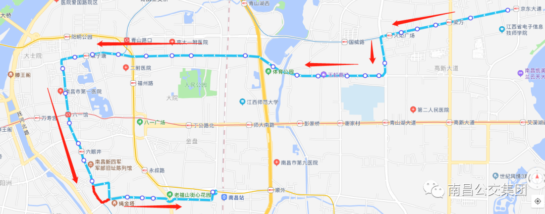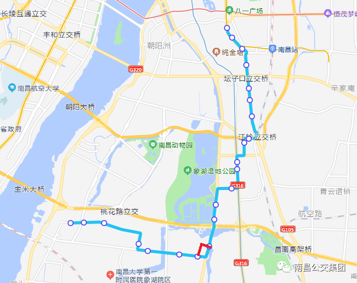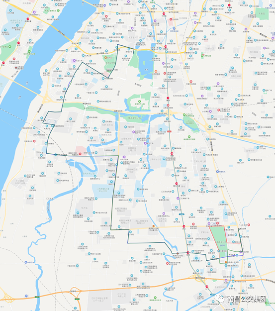 1、原线路走向:罗家集停车场—解放东路—高新南大道—新溪桥路—博学路—广州路—航空路—昌南大道—金沙大道—八月湖路—河洲路—芳湖路—公交新洪城大市场首末站北(往返,全程43公里);2、调整后线路走向:罗家集停车场—解放东路—高新南大道—广州路—航空路—昌南大道—金沙大道—八月湖路—河洲路—芳湖路—公交新洪城大市场首末站北(往返,全程43公里);3、线路走向图: