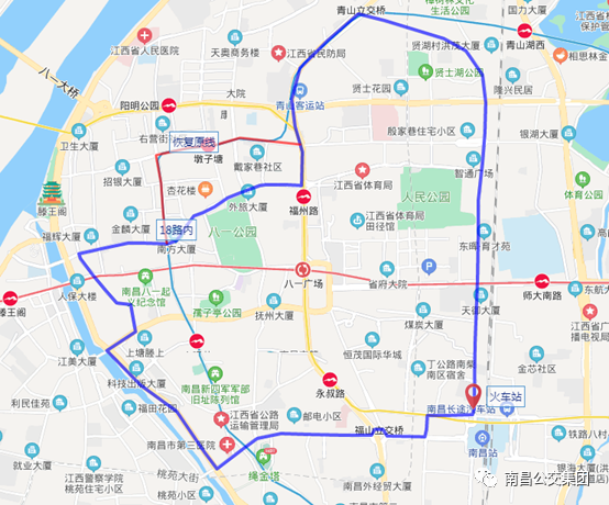 4、停靠站点:火车站、老福山西、公交保育院、绳金塔、里洲小区、抚河公园、抚河桥东、孺子路船山路口、万寿宫历史文化街区二号门、榕门路中山路口、民德路胜利路步行街口、南昌市第一医院、工人文化宫、省胸科医院、墩子塘、叠山路东口、青山南路南口、蓝海购物广场、江南都市花园、沙沟、市饲料公司、二七北路阳明东路口、二七北路南京西路口、二七北路福州路口、江西商报、二七北路北京西路口、二七南路金盘路口、二七南路岔道口西路口、火车站;