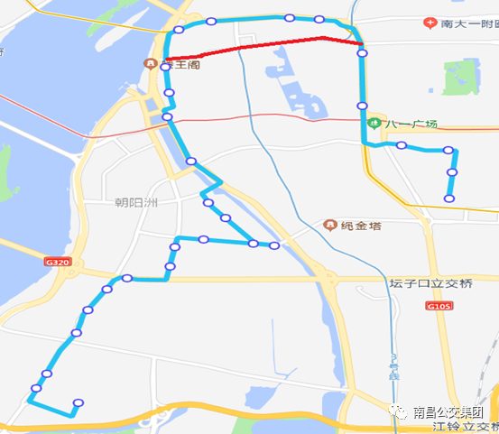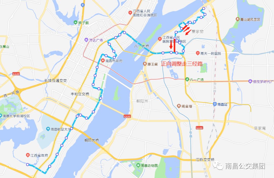 1、原线路走向:赣江桥停车场—赣桥南路—紫云路—起凤路—证券街—旭照路—三经路—龙沙路—沿江北大道—二七北路—三经路—爱国东路—五纬路—王家庄路—青山南路—阳明路—八一大桥—丰和中大道—绿茵路—赣江中大道—会展路—红谷中大道—翠苑路—赣江中大道—学府大道—红谷南大道—卧龙路—永泰一路—会昌路(往返,全程46.2公里);2、调整后线路走向:赣江桥停车场—赣桥南路—紫云路—起凤路—证券街—旭照路—三经路(爱国东路(反向)—五纬路(反向)—王家庄路(反向)—青山南路(反向))—阳明路—八一大桥—丰和中大道—绿茵路—赣江中大道—会展路—红谷中大道—翠苑路—赣江中大道—学府大道—红谷南大道—卧龙路—永泰一路—会昌路(往返,全程41.46公里);3、线路走向图: