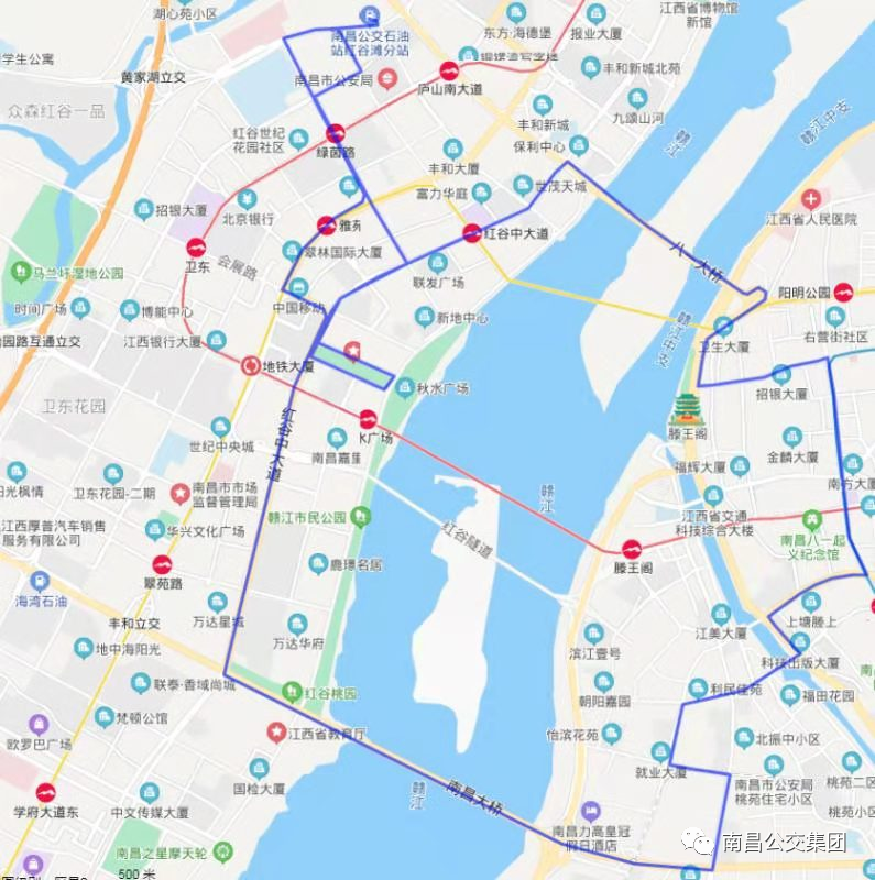 1、原线路走向:红谷配套中心—碟子湖大道—绿茵路—红谷中大道—南斯友好路—南昌大桥—洪城路—桃花路—朝阳洲南路—抚生路—朝阳洲中路—抚河桥—抚河北路—八一大桥—红谷中大道—新府路—赣江中大道—雄州路—红谷中大道—会展路—丰和中大道—绿茵路—沙井路—春晖路—碟子湖大道—红谷配套中心(往返,全程22公里);2、调整后线路走向:红谷配套中心—碟子湖大道—绿茵路—丰和中大道—会展路—红谷中大道—南斯友好路—南昌大桥—洪城路—桃花路—朝阳洲南路—抚生路—朝阳洲中路—抚河桥—抚河北路—孺子路—象山南路—象山北路—叠山路—抚河北路—八一大桥—红谷中大道—新府路—赣江中大道—雄州路—红谷中大道—绿茵路—沙井路—春晖路—碟子湖大道—红谷配套中心(往返,全程23公里);3、线路走向图: