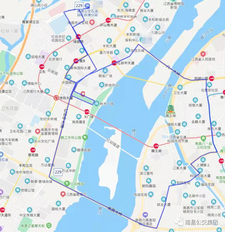二、恢复229路1、原线路走向:红谷配套中心—碟子湖大道—绿茵路—丰和中大道—会展路—红谷中大道—新府路—赣江中大道—雄州路—红谷中大道—八一大桥—阳明路—象山北路—象山南路—孺子路—抚河北路—抚河桥—朝阳洲中路—抚生路—洪城路—南昌大桥—南斯友好路—红谷中大道—绿茵路—沙井路—春晖路—碟子湖大道—红谷配套中心(往返,全程23.2公里);2、调整后线路走向:红谷配套中心—碟子湖大道—绿茵路—红谷中大道—新府路—赣江中大道—雄州路—红谷中大道—八一大桥—阳明路—象山北路—象山南路—孺子路—抚河北路—抚河桥—朝阳洲中路—抚生路—洪城路—南昌大桥—南斯友好路—红谷中大道—会展路—丰和中大道—绿茵路—沙井路—春晖路—碟子湖大道—红谷配套中心(往返,全程23.2公里);3、线路走向图: